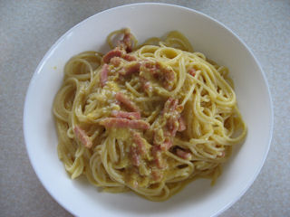 お昼ご飯はカルボナーラ風スパゲティを作ってみました